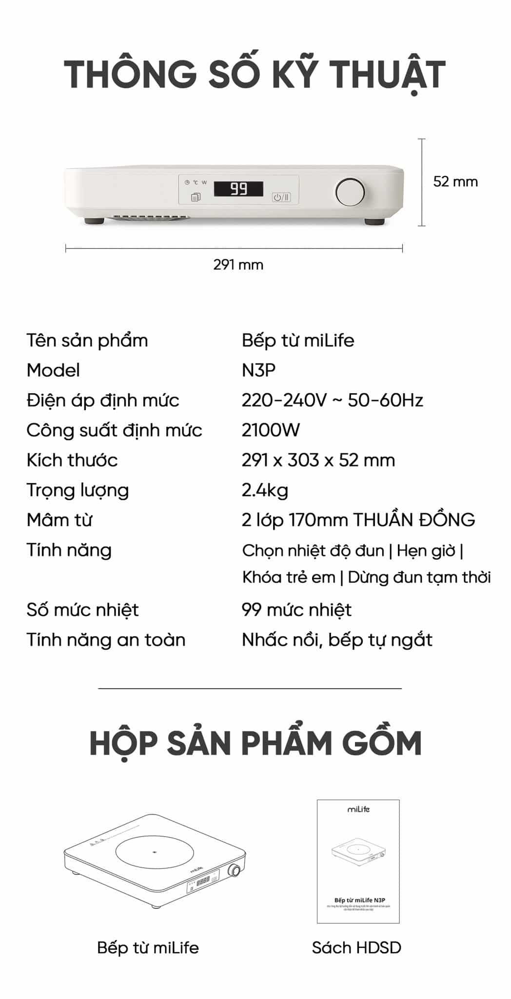 Dưới đây là các thông số kỹ thuật chính của bếp từ miLife N3P 99 mức nhiệt giúp bạn hiểu rõ hơn về sản phẩm: