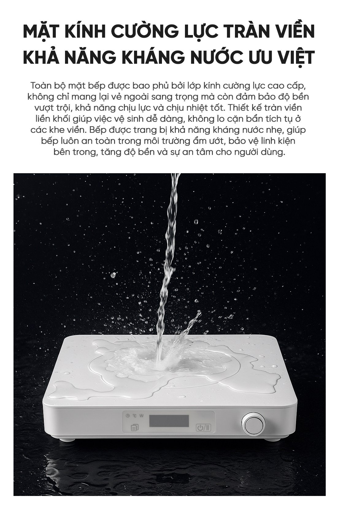- Chất liệu mặt bếp: Kính cường lực chống xước
