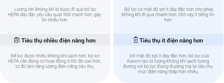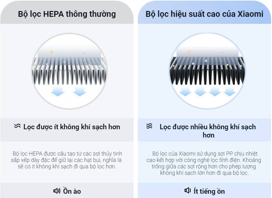 4. Sự khác biệt giữa Bộ lọc hiệu suất cao của Xiaomi và Bộ lọc HEPA thông thường: Kết hợp hai công nghệ lọc: Sạc tĩnh điện và lọc cơ khí, bộ lọc hiệu suất cao của Xiaomi có khả năng loại bỏ 99,97% các hạt bụi có kích cỡ nhỏ đến 0,3 micromet trong không khí. So với bộ lọc HEPA thông thường, bộ lọc này hoạt động ít ồn hơn và tiêu thụ ít năng lượng hơn.
