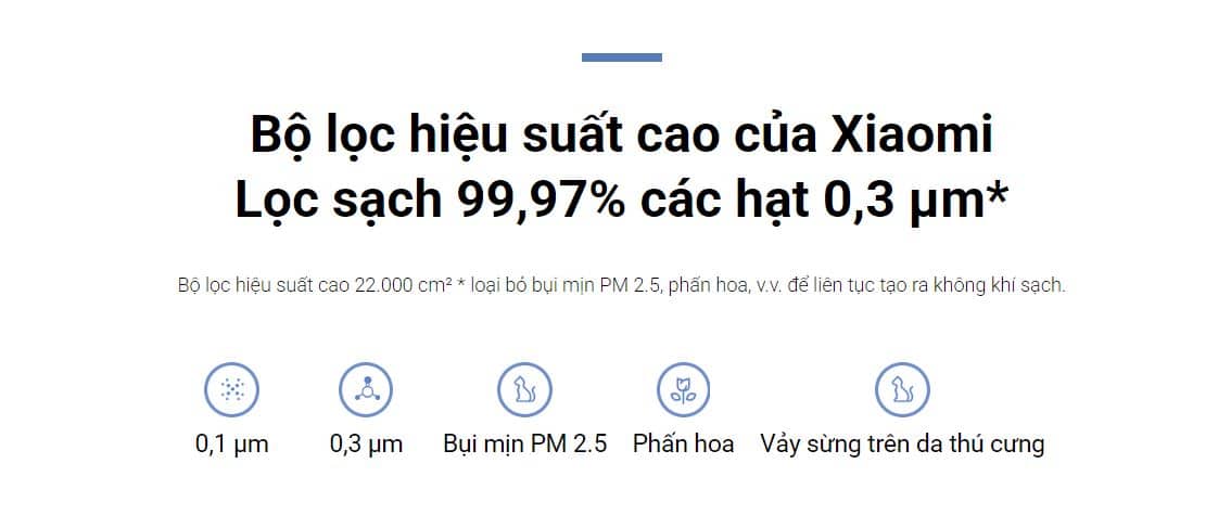 2. Bộ lọc hiệu suất cao của Xiaomi: Với diện tích lớn lên đến 24.000 cm², bộ lọc này loại bỏ 99,97% các hạt có kích thước nhỏ đến 0,3 micromet, bao gồm bụi mịn PM 2.5, phấn hoa và các chất khác, mang lại không khí sạch và trong lành.