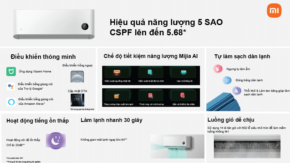 Điều Hòa Mijia Air Conditioner Pro Eco Inverter có hai phiên bản với công suất làm lạnh khác nhau: 9500 BTU/h (1HP) và 12500 BTU/h (1.5HP). Với hiệu suất năng lượng 5 sao, CSPF của sản phẩm lần lượt là 5.68 cho phiên bản 1HP và 5.38 cho phiên bản 1.5HP. Điều này cho thấy sản phẩm không chỉ giúp tiết kiệm năng lượng mà còn mang lại hiệu quả làm lạnh nhanh chóng.