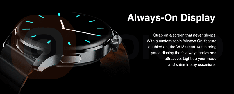 Nhà sản xuất đã nâng cấp đồng hồ thông minh Xiaomi Imilab W13 với tính năng Always-On Display chỉ xuất hiện trên những thiết bị có màn hình OLED hay AMOLED. Nhờ vậy, khi xem ngày giờ, người dùng không cần phải chạm vào màn hình hay nhấc cổ tay lên. Tính năng màn hình luôn sáng giúp bạn xem ngày giờ và đọc các thông báo nhanh chóng, không cần tốn thời gian như trước đây.