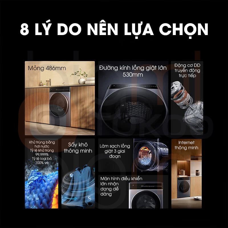 10. **Điều khiển qua App thông minh**: Có khả năng điều khiển máy thông qua ứng dụng trên điện thoại, giúp bạn dễ dàng quản lý và theo dõi quá trình giặt sấy từ xa.