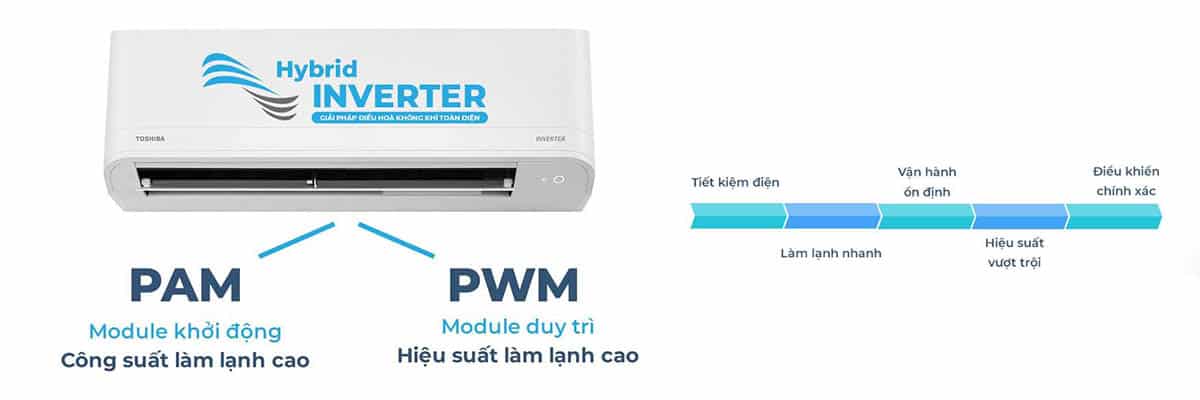 Thiết bị được trang bị công nghệ Hybrid Inverter, giúp điều chỉnh tần số máy nén linh hoạt theo nhu cầu thực tế và tránh bật / tắt ngắt quãng. Nhờ thế: