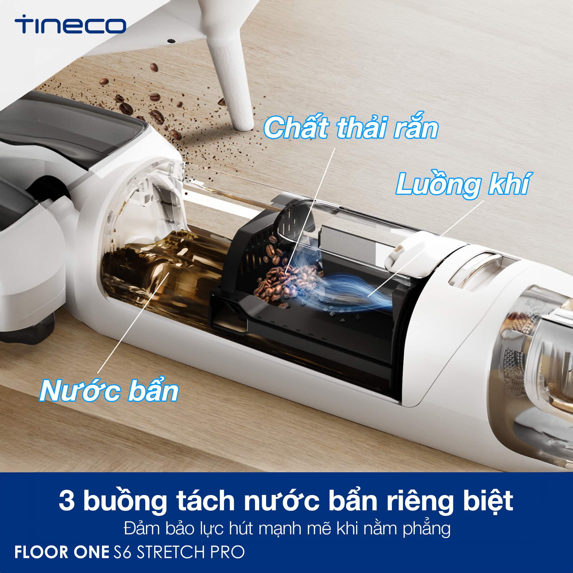 Tineco Floor One S6 Stretch Pro sở hữu hệ thống 3 buồng tách nước bẩn riêng biệt