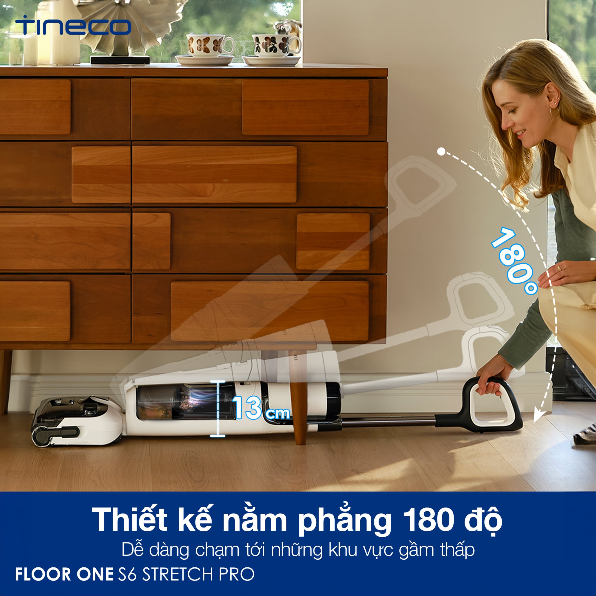 Máy có thiết kế siêu mỏng và cơ cấu tách nước thông minh, cho phép nằm phẳng 180° với chiều cao chỉ 13cm giúp máy dễ dàng vào những khu vực gầm thấp, loại bỏ bụi bẩn và vi khuẩn ở những nơi khó tiếp cận.