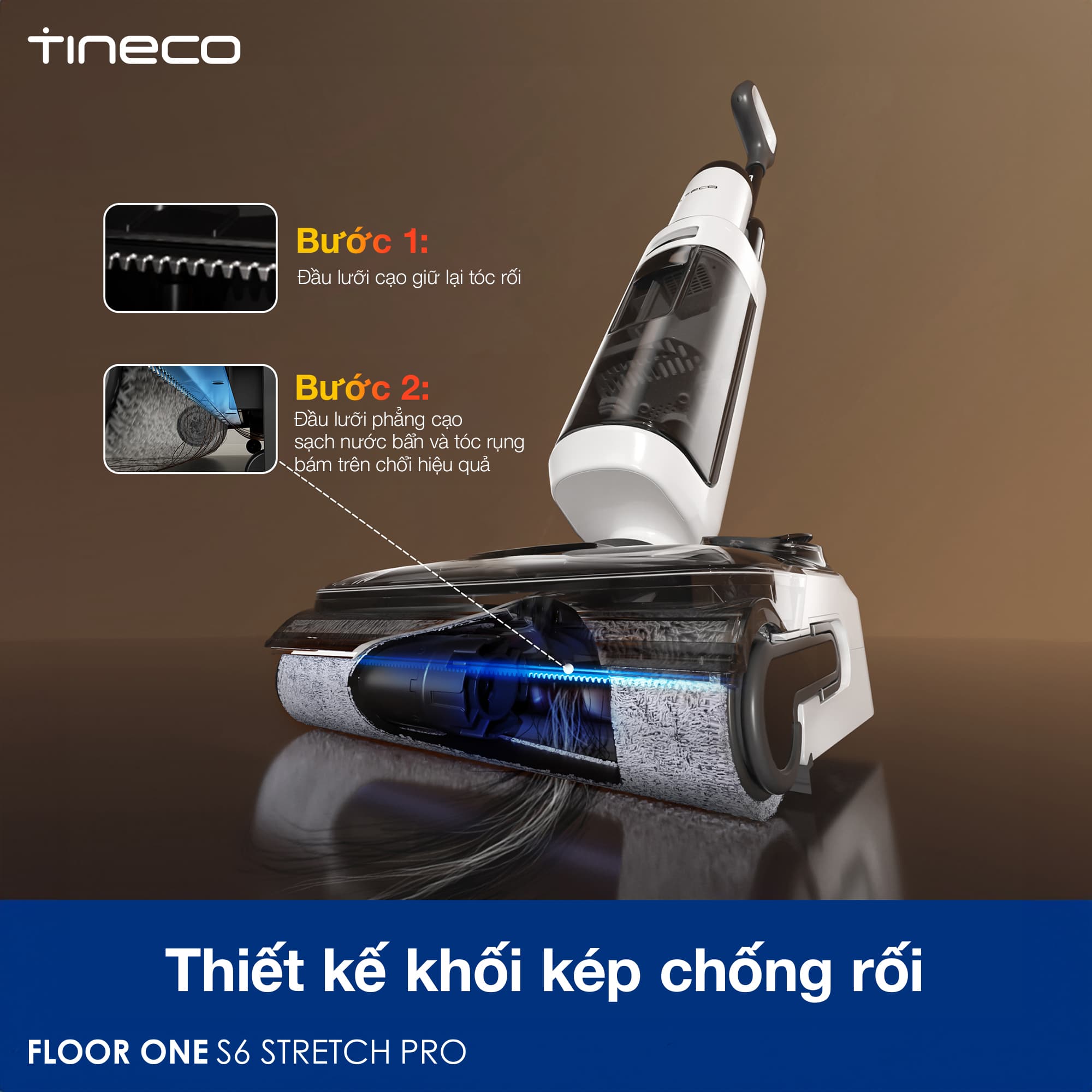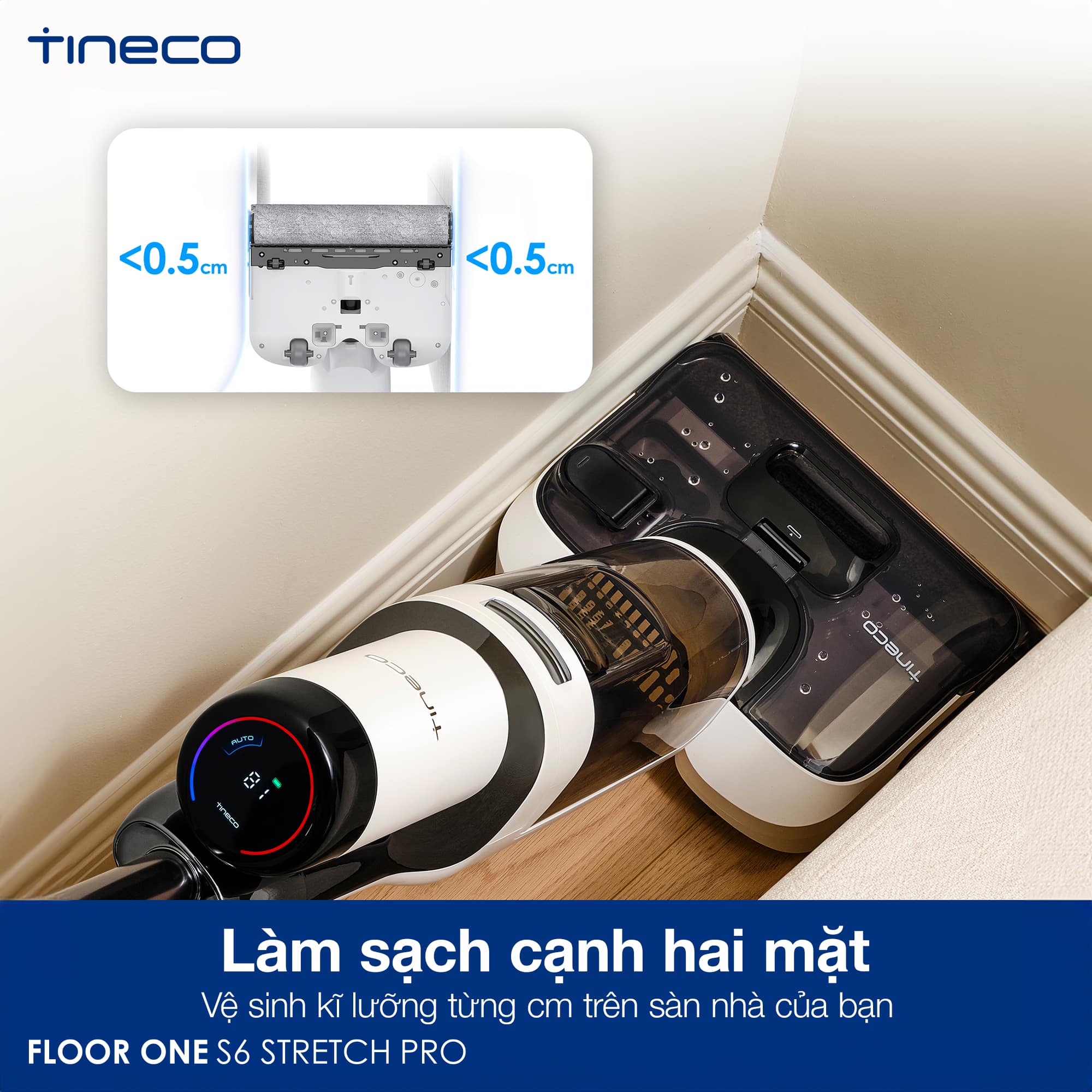 Máy lau nhà khô ướt cầm tay Tineco Floor One S6 Stretch Pro trang bị con lăn tràn viền làm sạch cạnh 3 chiều