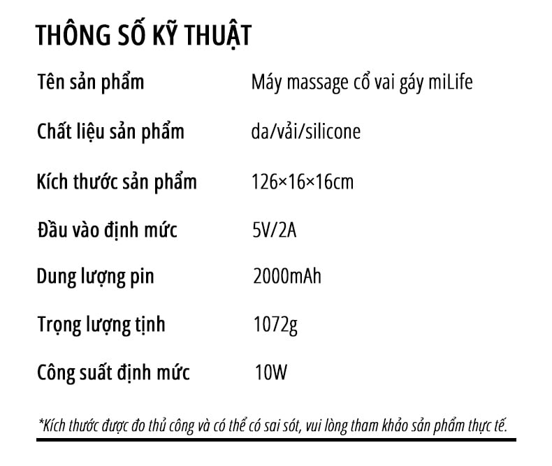 Dưới đây là một số thông số kỹ thuật nổi bật của Máy massage cổ vai gáy miLife: