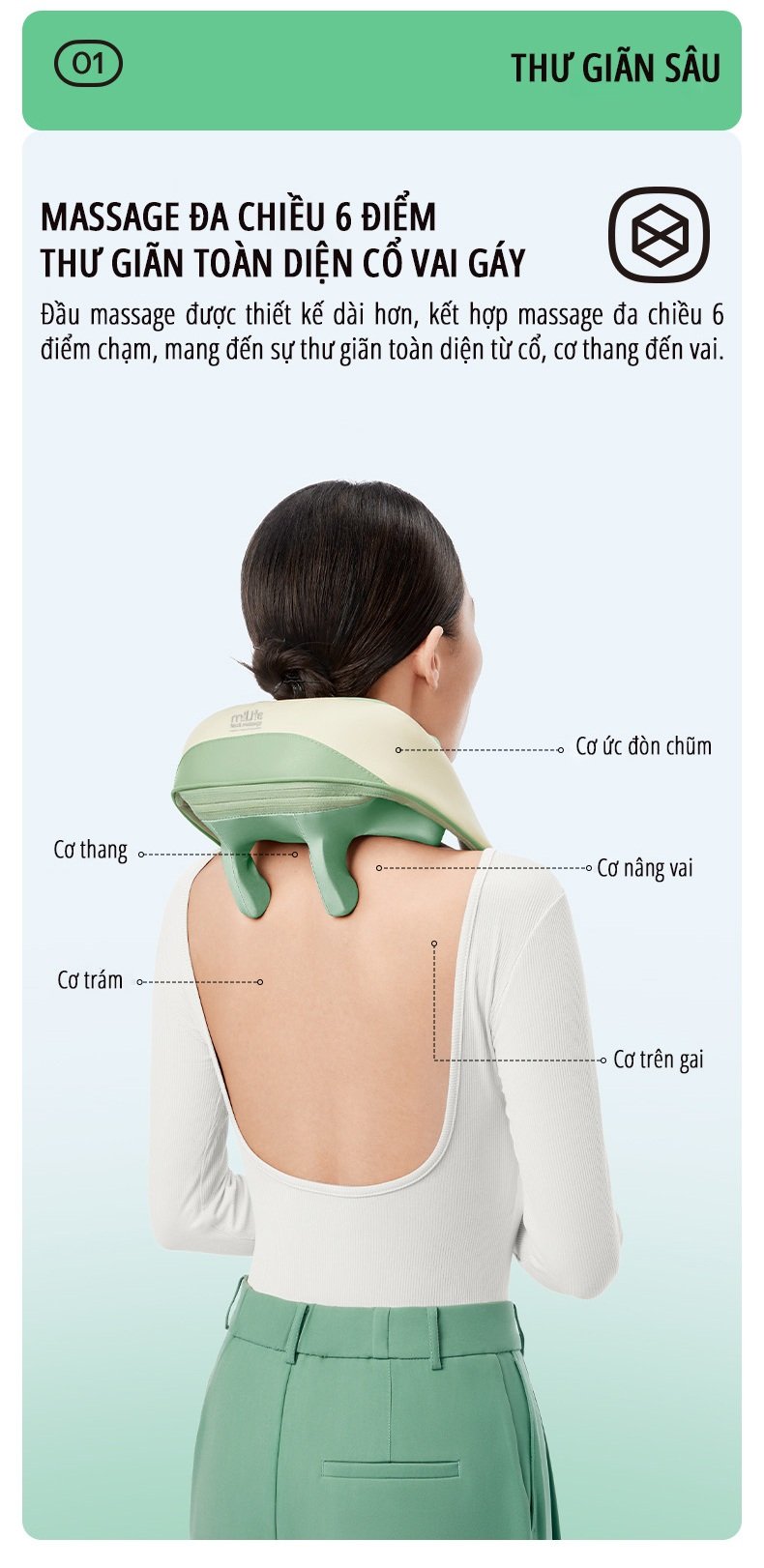- Giảm Đau Nhức: Với các chế độ massage nhẹ, máy giúp xoa dịu các cơn đau nhức ở cổ, vai và gáy.