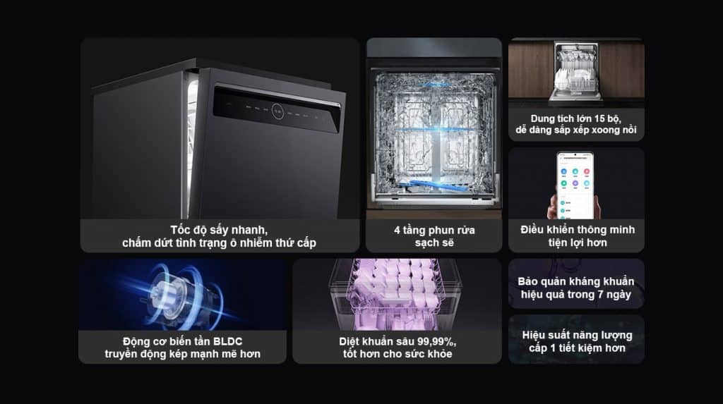 Gồm 4 tầng phun rửa sạch sẽ, dung tích lớn 15 bộ, dễ dàng sắp xếp xoong nồi. Động cơ biến tần BLCD truyền động kép mạnh mẽ, cùng hiệu suất năng lượng cấp 1 tiết kiệm hơn. Tốc độ sấy nhanh, chấm dứt tình trạng ô nhiễm thứ cấp. Bảo quản kháng khuẩn hiệu quả trong 7 ngày, diệt khuẩn sâu lên đến 99,99%, tốt hơn cho sức khỏe. Sử dụng điều khiển thông minh tiện lợi hơn cho người dùng.