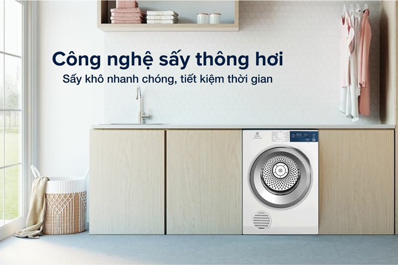 Máy hoạt động trên nguyên lý thông hơi, có thể dễ dàng kết nối với hệ thống thông gió trong nhà, giúp không khí bên trong máy được trao đổi và làm khô quần áo hiệu quả. Nhờ vào thiết kế này, máy có thể sấy khô quần áo nhanh chóng mà không bị ẩm ướt hay khó chịu.