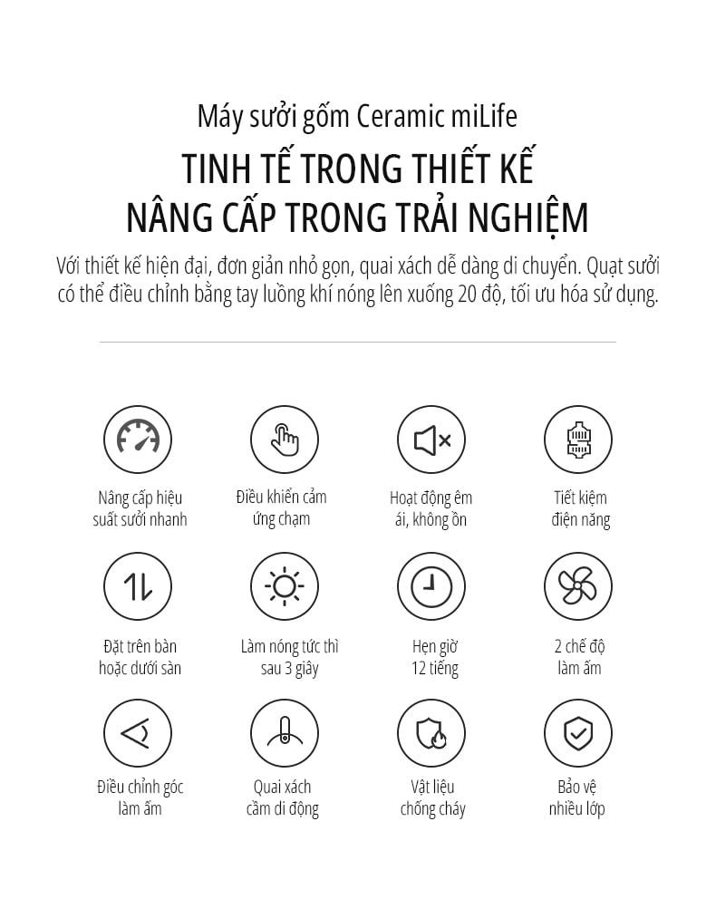 Dưới đây là các thông số kỹ thuật nổi bật của Máy sưởi gốm ceramic miLife:
