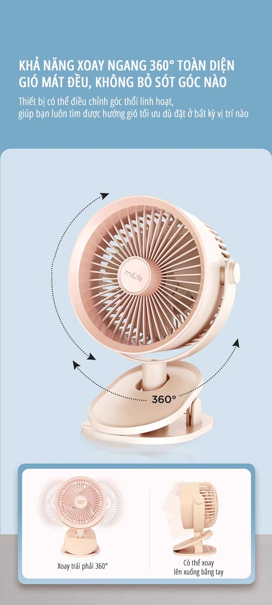 Một trong những ưu điểm nổi bật của Quạt kẹp tích điện miLife F3B 18cm chính là khả năng điều chỉnh hướng gió linh hoạt. Bạn có thể dễ dàng điều chỉnh góc quạt lên xuống, trái phải để tạo ra luồng gió thoải mái nhất. Đây là tính năng rất hữu ích, giúp bạn dễ dàng tùy chỉnh theo nhu cầu sử dụng.