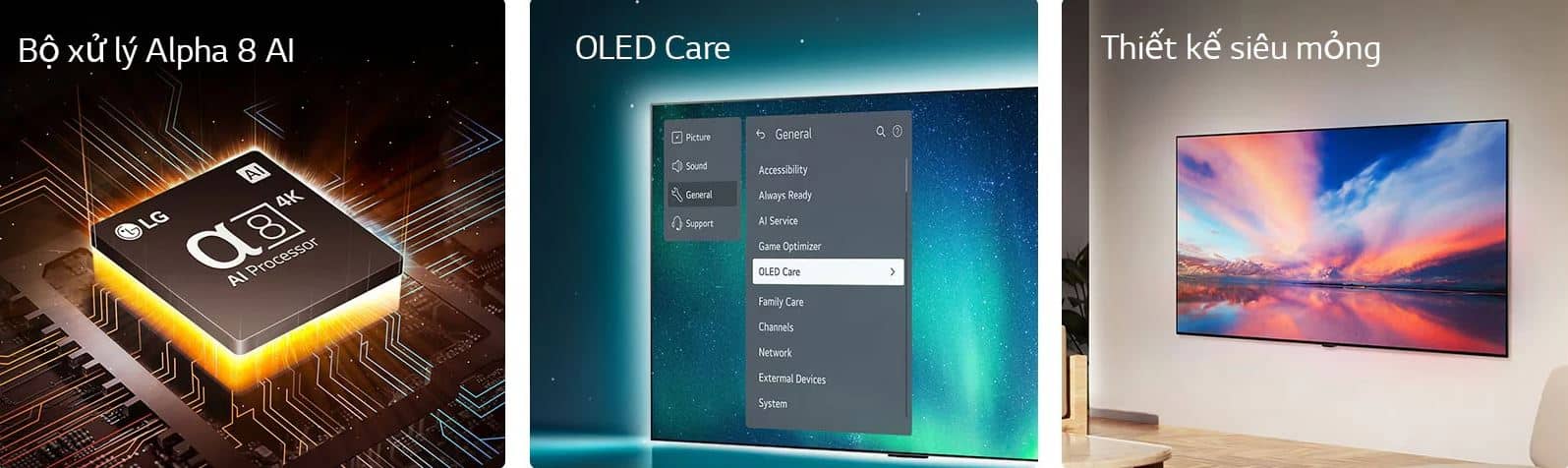 Bộ xử lý Alpha 8 AI: Tối đa trí tuệ cùng bộ xử lý trung tâm, với cải tiến công nghệ qua 11 năm đột phá, tái hiện từng khung hình OLED nguyên bản, tuyệt mĩ.