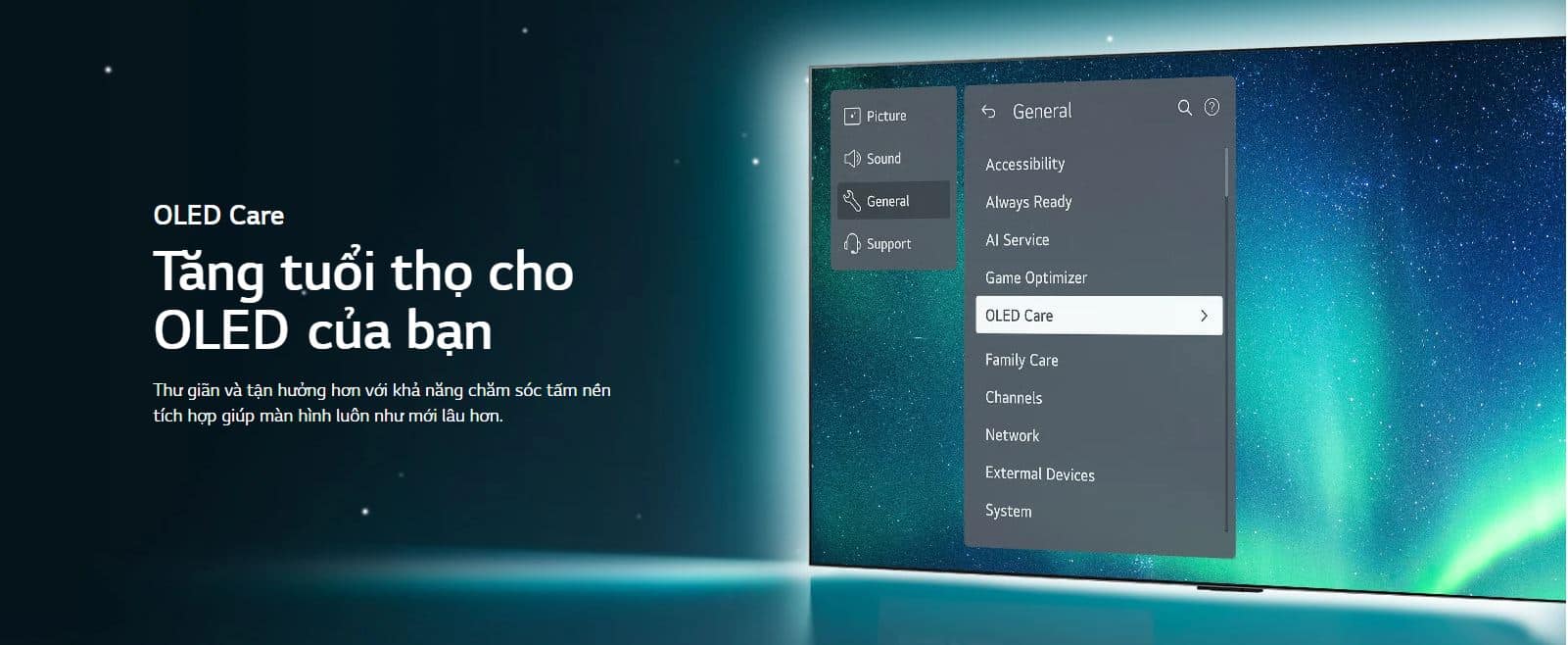 Khúc biến tấu của hàng triệu điểm ảnh phát sáng rực rỡ, độc lập trong từng khung hình mà không cần tới sự trợ giúp của ánh sáng đèn nền mờ, tạo nên tuyệt tác với sắc đen hoàn hảo. Với các chứng nhận về mức độ hạn chế ánh sáng xanh, không nhấp nháy từ Công nghệ Eye Comfort, LG OLED bảo toàn thị lực tinh anh cho cả gia đình, gia tăng thời gian tận hưởng.