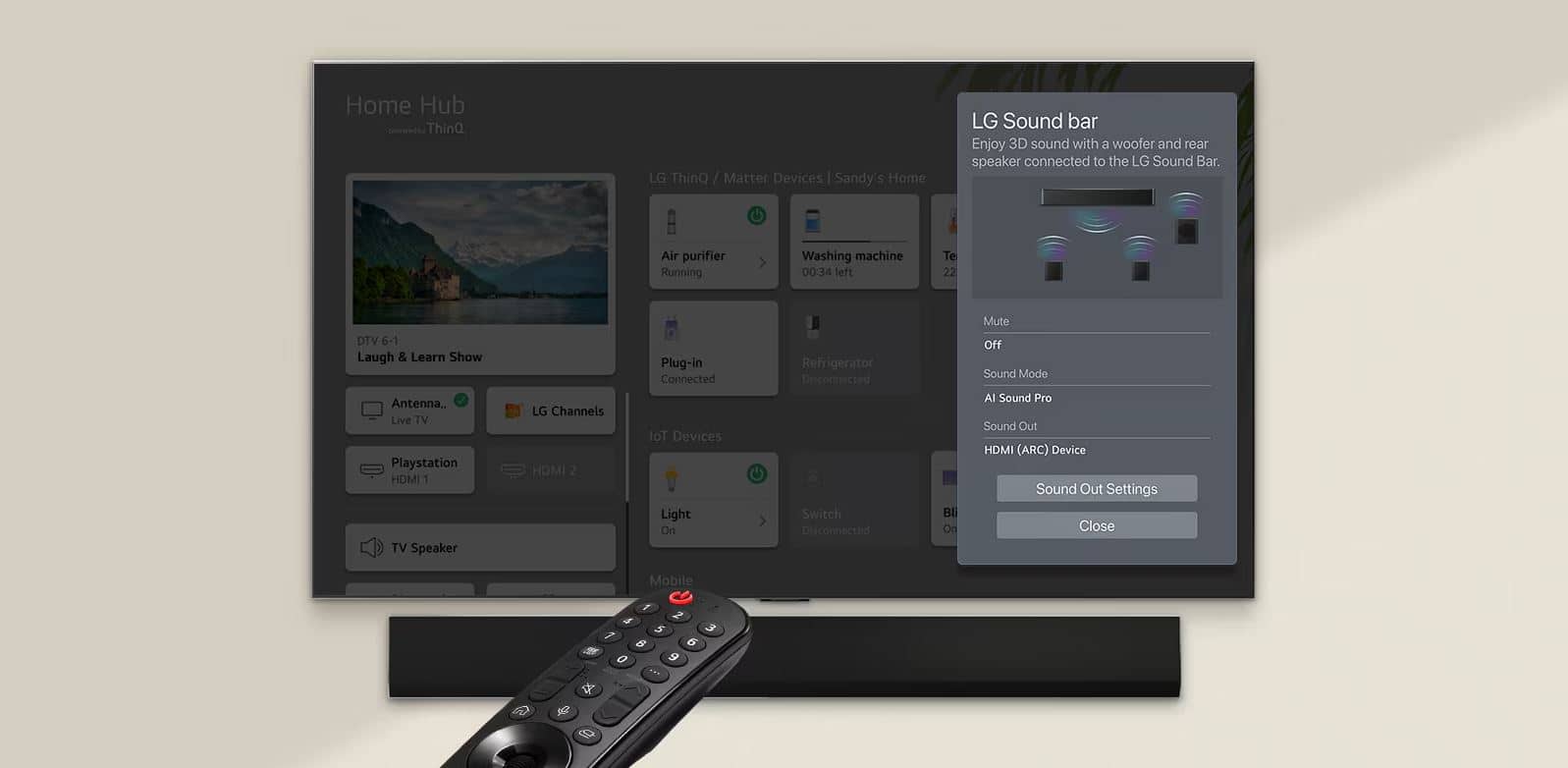 Truy cập WOW Interface trên TV LG để điều khiển soundbar đơn giản và rõ ràng, như thay đổi chế độ âm thanh, hồ sơ và truy cập các tính năng tiện dụng khác.