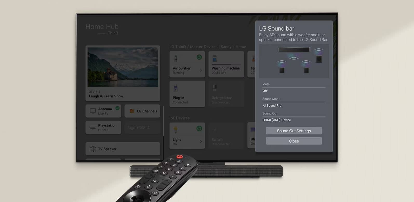 Truy cập WOW Interface trên TV LG để điều khiển soundbar đơn giản và rõ ràng, như thay đổi chế độ âm thanh, hồ sơ và truy cập các tính năng tiện dụng khác.