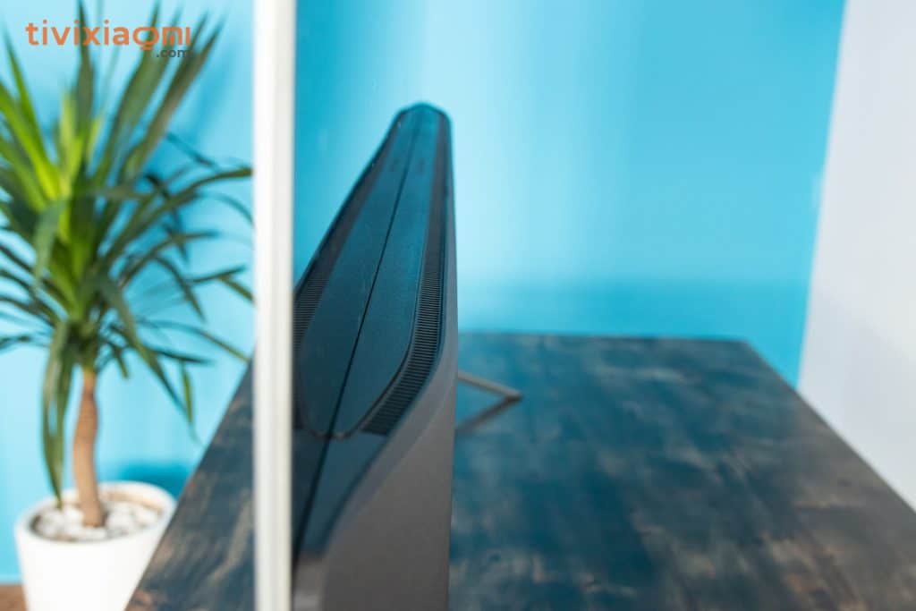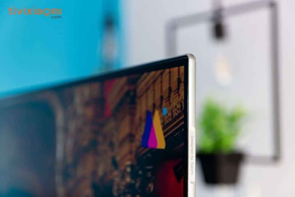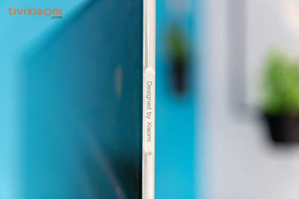 Điểm gây ấn tượng lớn nhất đối với người dùng về thiết kế chắc chắn đó chính là cạnh viền của sản phẩm, phần viền 2 cạnh này được làm rất mỏng phía cạnh phải chúng ta có dòng chữ “Designed by Xiaomi” và phần viền này được làm bằng kim loại sáng bóng tạo cảm giác chắn chắn nhưng lại rất sang trọng cho người dùng. Phía cạnh dưới chúng ta có logo của Xiaomi và cụm đèn led tín hiệu cũng như một nút nguồn nhỏ phía dưới đáy.