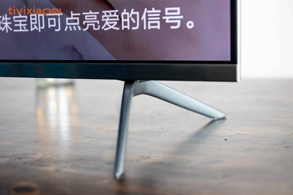 Chúng ta sẽ có ở đây một màn hình khá lớn lên tới 55″. Cũng chính vì kích thước màn hình lớn và trọng lượng của sản phẩm cũng không hề nhẹ nên Xiaomi đã trang bị 2 chân đế bằng kim loại hình chữ V màu xám chì rất chắc chắn đi kèm.