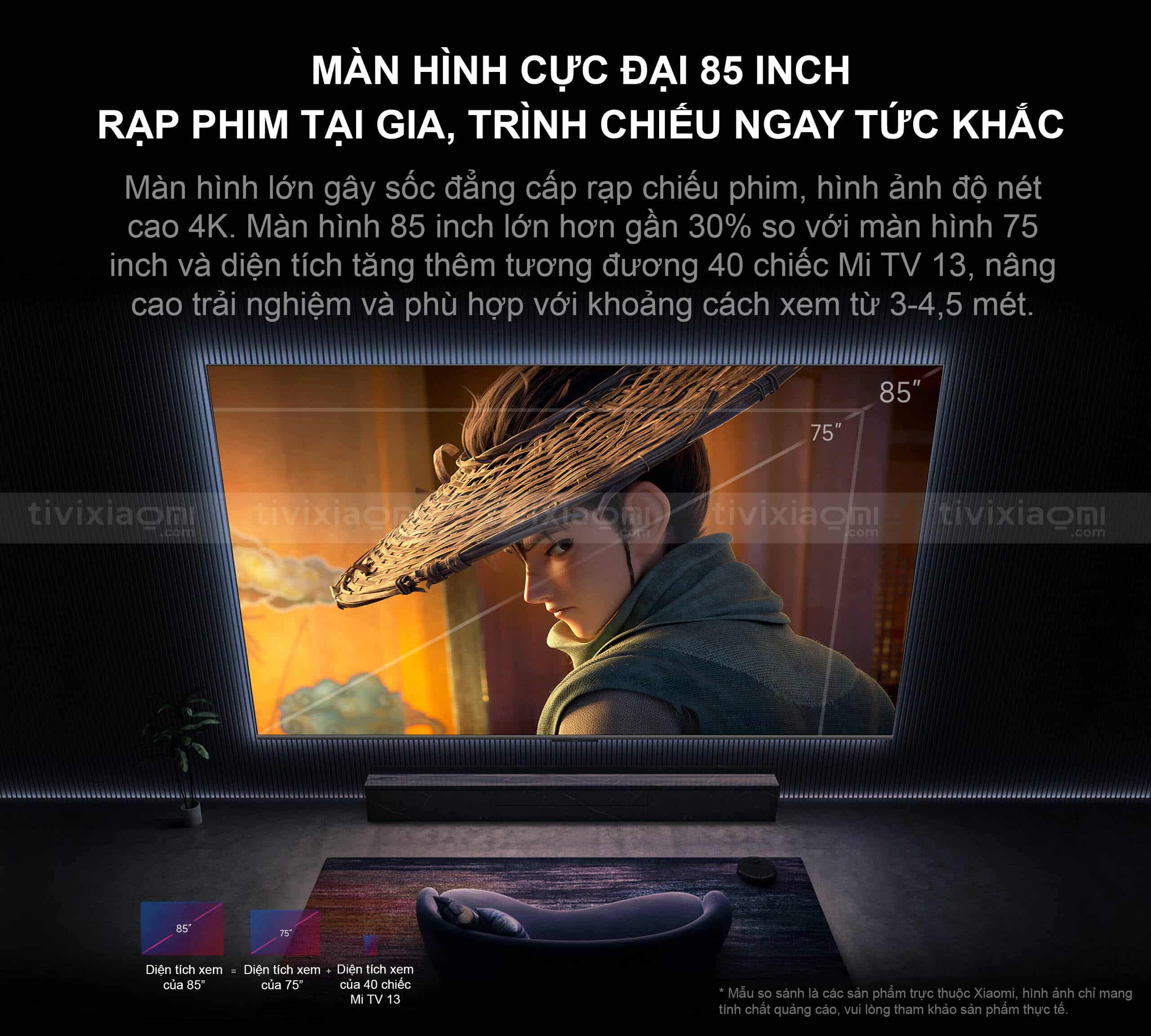 Siêu phẩm Tivi Xiaomi X85 inchmàn hình lớn gây sốc đẳng cấp rạp chiếu phim, hình ảnh độ nét cao 4K. Màn hình 85 inch lớn hơn gần 30% so với màn hình 75 inch và diện tích tăng thêm tương đương 40 chiếc Mi TV 13, nâng cao trải nghiệm và phù hợp với khoảng cách xem từ 3-4,5 mét.